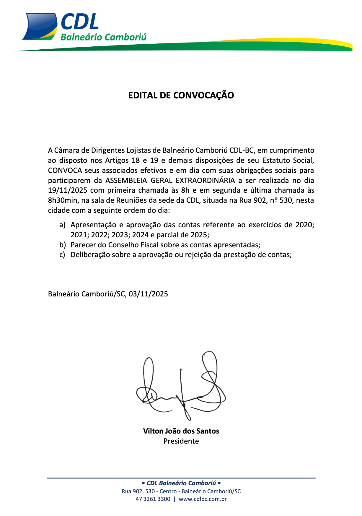 A Câmara de Dirigentes Lojistas de Balneário Camboriú CDL-BC, em cumprimento ao disposto nos Artigos 18, 20 e 21 e demais disposições de seu Estatuto Social, CONVOCA seus associados efetivos e em dia com suas obrigações sociais para participarem da ASSEMBLEIA EXTRAORDINÁRIA a ser realizada no dia 01/02/2023 com primeira chamada às 8h e em segunda e última chamada às 8h30min, na sede da C...