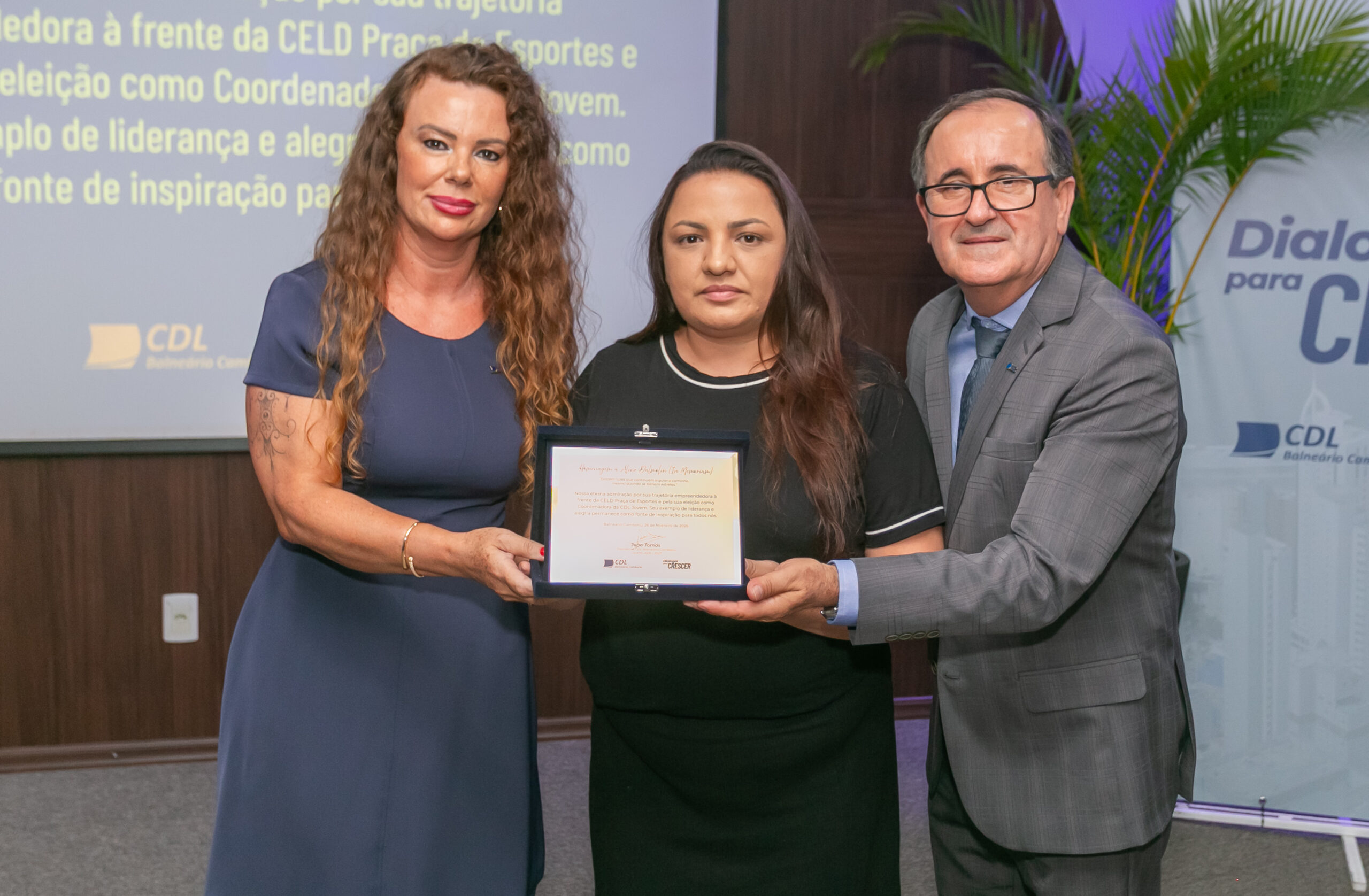 A emoção seguiu com o tributo póstumo à Aline Dalmolin, que seria empossada coordenadora da CDL Jovem. A homenagem foi recebida por Meithieli Pittol Vieira, gestora da CELD Praça de Esportes.