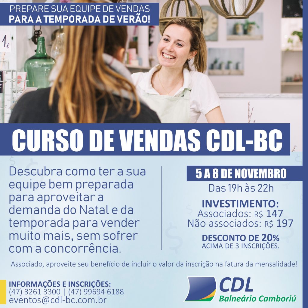 O último trimestre do ano é responsável por aquecer a economia das cidades m razão do aumento das vendas de final de ano. Época em que os lojistas abrem vagas para quem procura uma oportunidade para ingressar no mercado de trabalho, embora que de forma temporária. Pensando na melhoria do atendimento ao consumidor final e na qualificação dos profissionais do varejo, a CDL de Balneário Camboriú, promove de 5 a 8 de novembro, das 19h às 22h, em seu auditório, um curso de vendas que tem como objetivo oferecer qualificação aos profissionais que atuam no comércio, bem como aos interessados nesta área de atuação. Também prepará-los para aproveitar a demanda do Natal e temporada de Verão sem sofrer com a concorrência.